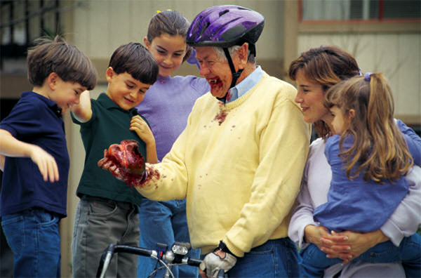 Even with the neighborhood kids, Grampa Lucius was generous with his time and genuinely enjoyed sharing the fruit of his centuries of experience. Having just finished demonstrating the "right" way to carry out a ritualistic sacrifice via Death Bike (as if HIS way was the ONLY way!), Grampa L held aloft the still beating heart of his victim for all to see. To the delight and rapt attention of his youthful audience, he ceremoniously took a big bite - spraying blood onto his Easter sweater. After a good laugh, Carol tugged on Grampa's sleeve. "Okay Lucius, enough showing off for one afternoon. It's time for your nap."